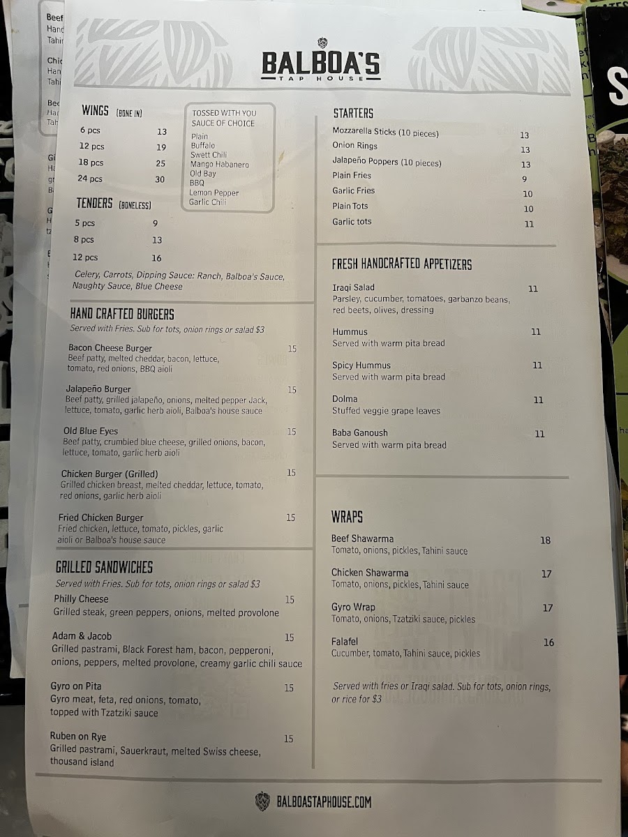 Welcome to Balboa's Tap House, a hidden gem located at 4421 Genesee Ave, San Diego. This vibrant eatery offers a unique twist on traditional pub food, featuring a Mediterranean-inspired menu that delights the senses. Start your culinary journey with handcrafted appetizers, including the refreshing Iraqi Salad and rich Baba Ghanoush, each priced at just $11. For those looking for something heartier, the delectable selection of wraps, such as the savory Beef Shawarma and zesty Falafel Wrap, are available for $16-$18.